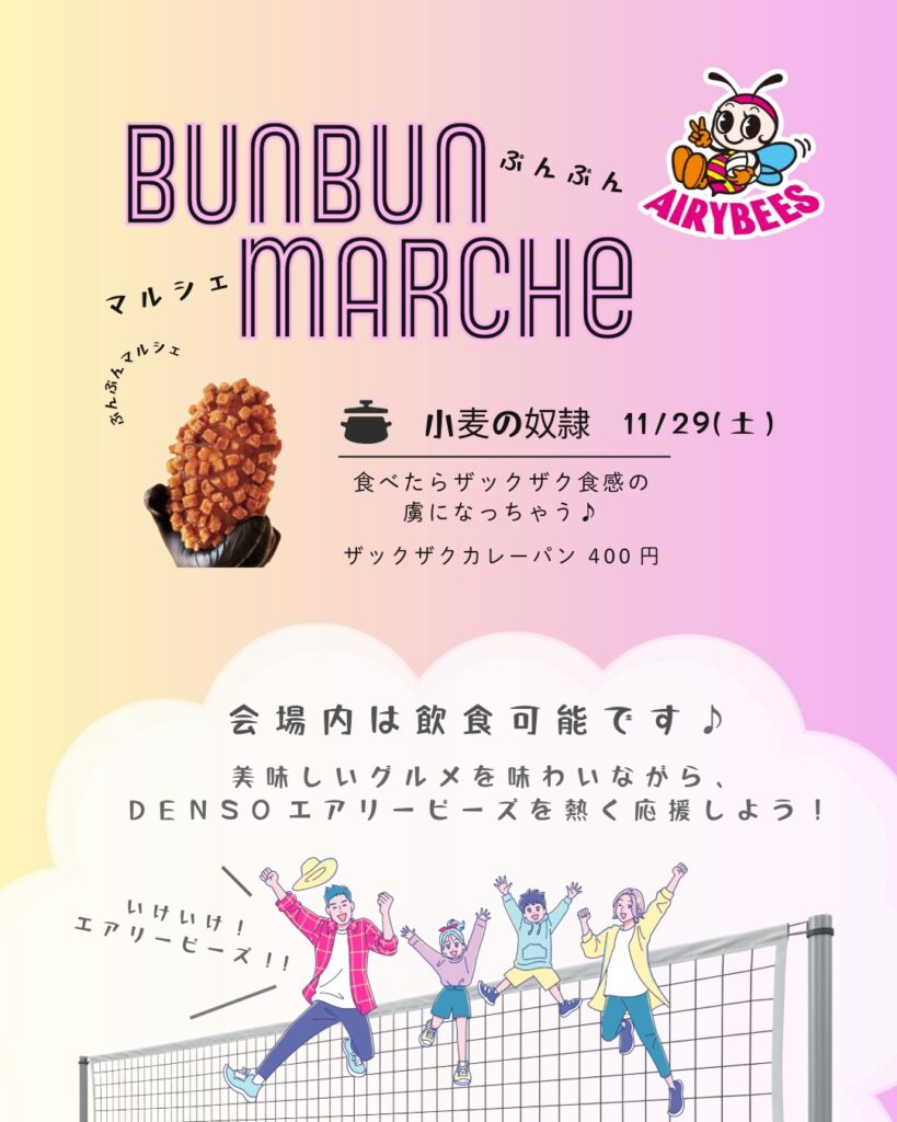 《DENSOエアリービーズ vs 岡山》試合会場にて、アリーナグルメイベント『ぶんぶんマルシェ』を開催いたします。